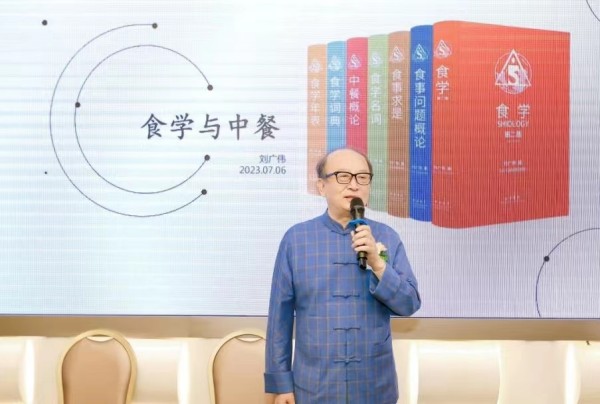 刘广伟先生发表了题为《食学与中餐》的主旨演讲。他从多个维度阐述了他的中餐学术研究新成果。其一,将“中餐=烹饪”的传统理念,拓展为“中餐=烹饪+发酵+碎解”的整体理念,也就是说,中餐不仅是烹饪和盘子里的菜,而是餐桌上的所有产品,也包括茶、酒等发酵产品;同时他将“中餐=食物加工”的传统理念,拓展为“中餐=食物加工+吃事范式”的整体理念。中餐不仅是加工技艺,使用筷子、圆桌围坐、食补食疗、吃事礼仪等也是中餐的重要组成。