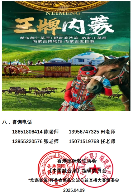 中下旬举办“炊谋宴策”杯美食菜品交流(免费)公益直播大赛,进行网络直播,全员参与选拔优秀作品,参赛获奖作品著作版权归香港国际餐饮协会餐旅创智创赢工作室所有。具体事宜通知如下: