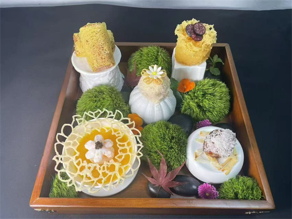 制作方法:100克鸡汤加入南瓜蓉20克、盐1.5克、瑶柱汁2克、生粉15克下锅熬成粘稠状即可、墨鱼胶200克加入蛋清40克冰水80克放入破壁机打成墨鱼胶用裱花袋做出花朵状再取20克墨鱼胶搓成圆球同花朵状一起下蒸锅中火蒸5分钟装盘即可。