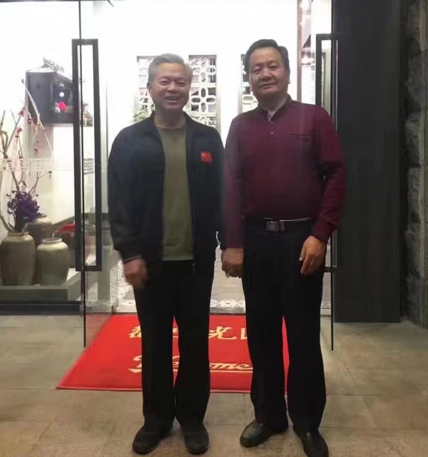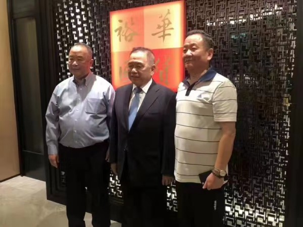 张建汀大师和原全国政协常委、全国侨联副主席余国春,全国政协委员、香港裕华国货总经理余鹏春合影