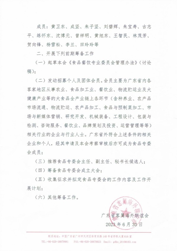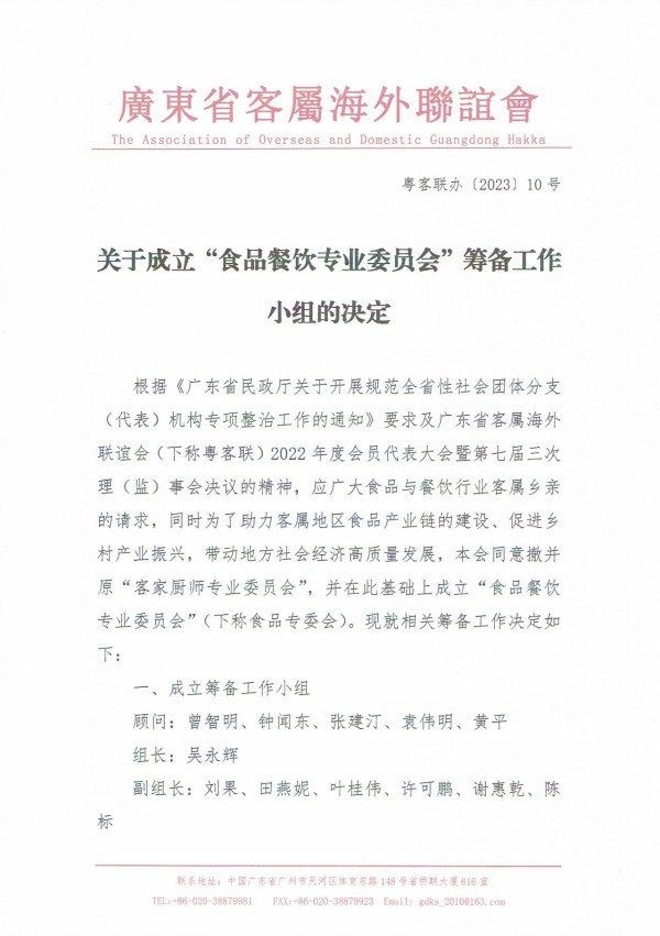 经充分协商,与会各方作出了《关于成立“食品餐饮专业委员会”筹备工作小组的决定》(内容附后),欢迎广大客属乡亲踊跃报名参与,联系方式:020-38879981(秘书处),邮箱:gdks_2010@163.com。