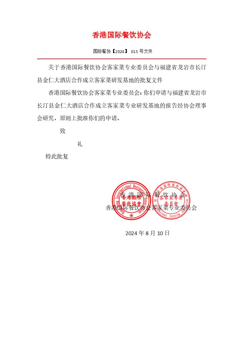关于香港国际餐饮协会客家菜专业委员会与福建省龙岩市长汀县金仁大酒店合作成立客家菜研发基地的批复文件