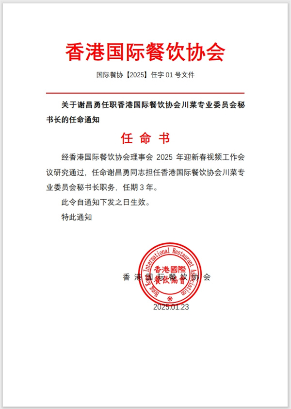 关于谢昌勇任职香港国际餐饮协会川菜专业委员会秘书长的任命通知