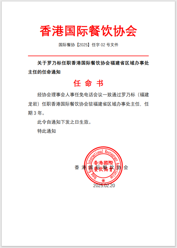 关于罗乃标任职香港国际餐饮协会福建省区域办事处主任的任命通知