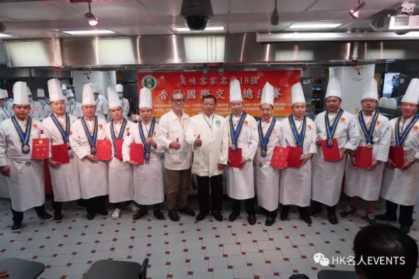 客家名厨在港決賽袁偉明(中)、戴龍(右五)等頒發奪得特金獎的廚師。鄧光榮(右六)、梁輝雄(左六)頒發奪得白金獎的廚師。高榮新(左六)和李招榮(中)頒發奪得金獎的廚師。 張建汀(左)表示,總決賽選在香港舉辦,是為了給眾…